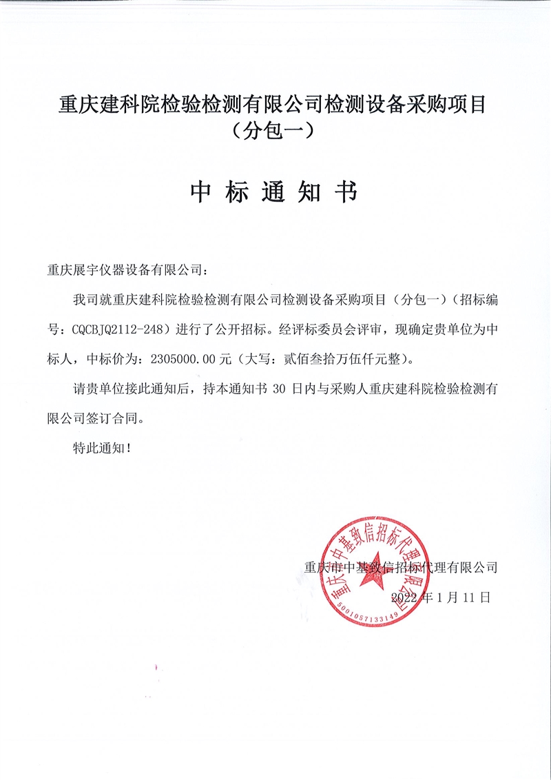 重慶建科院檢驗檢測有限公司委托重慶市中基致信招標代理有限公司對我公司檢測設備采購項目(項目號:CQCBJQ2112-248 )分包一(力學)和分包二(化學)進行了公開招標采購,現(xiàn)已完成全部采購程序。確認重慶展宇儀器設備有限公司為分包一(力學)中標人,中標價為2305000元(貳佰參拾萬伍仟佰元整)。確認重慶典鼎科技有限公司為分包二(化學)中標人,中標價為1828000元(壹佰捌拾貳萬捌仟元整)。
