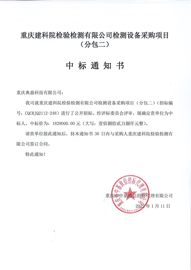 重慶建科院檢驗檢測有限公司委托重慶市中基致信招標代理有限公司對我公司檢測設備采購項目(項目號:CQCBJQ2112-248 )分包一(力學)和分包二(化學)進行了公開招標采購,現(xiàn)已完成全部采購程序。確認重慶展宇儀器設備有限公司為分包一(力學)中標人,中標價為2305000元(貳佰參拾萬伍仟佰元整)。確認重慶典鼎科技有限公司為分包二(化學)中標人,中標價為1828000元(壹佰捌拾貳萬捌仟元整)。